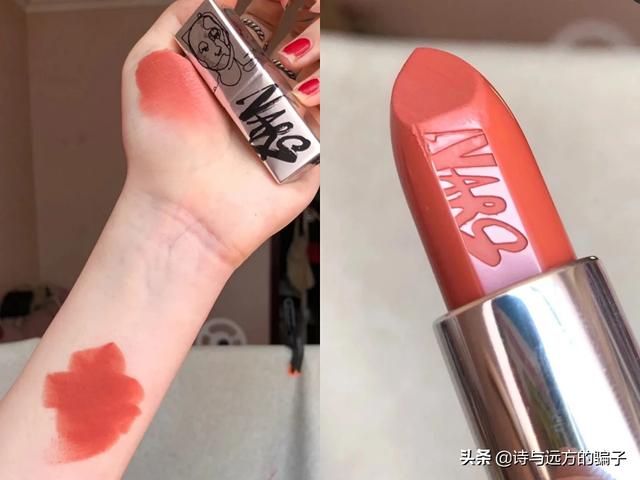 最后這支來自nars 2019年的藝術家聯名限定,顏色是一個蜜桃橘,特別得減齡顯氣色 并且色調柔和的同時,因為是啞光妝效,因此遮蓋唇色效果也很好,有點胡蘿卜色得感覺,不怎么挑皮